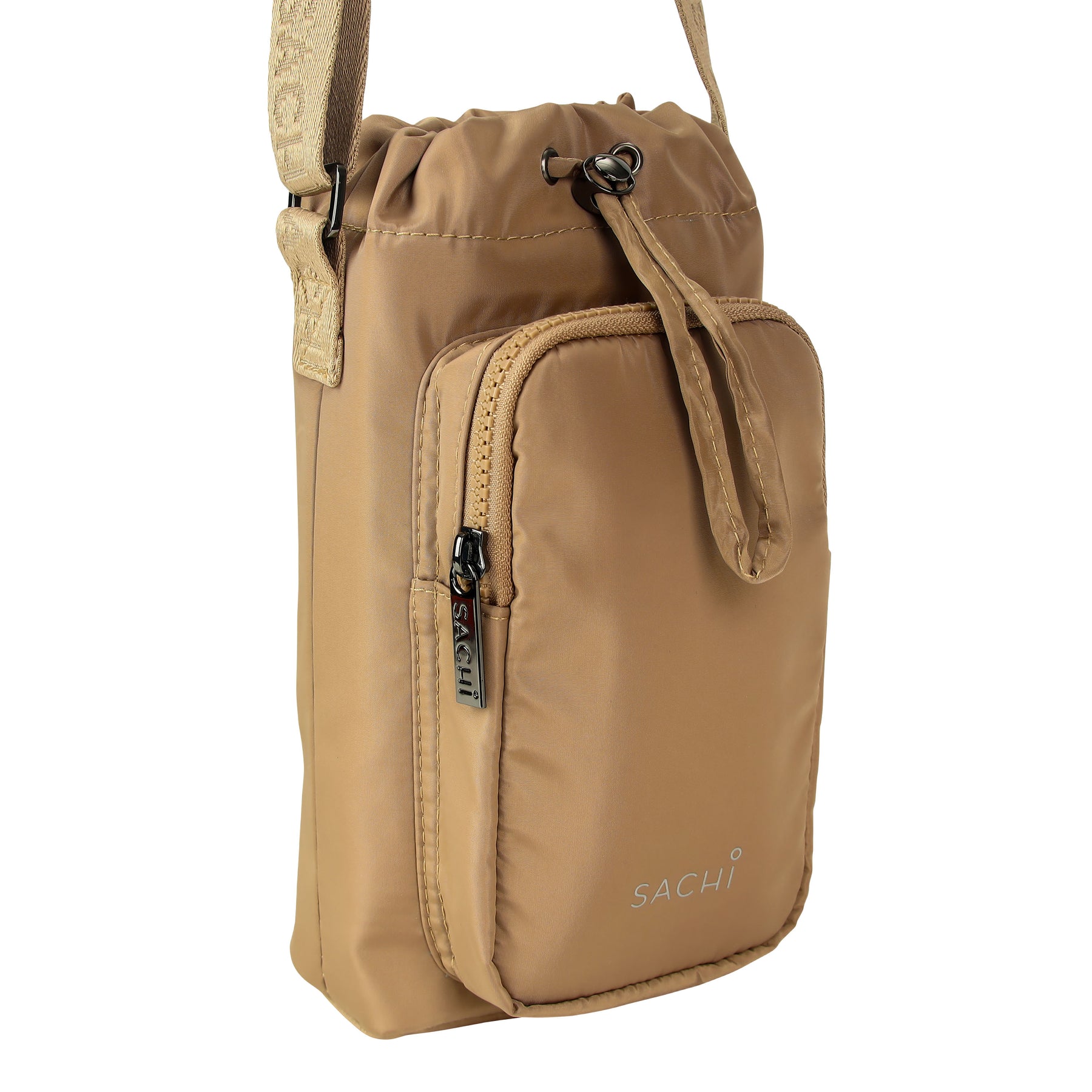 - Adjustable, removable crossbody strap featuring jacquard Sachi branding.